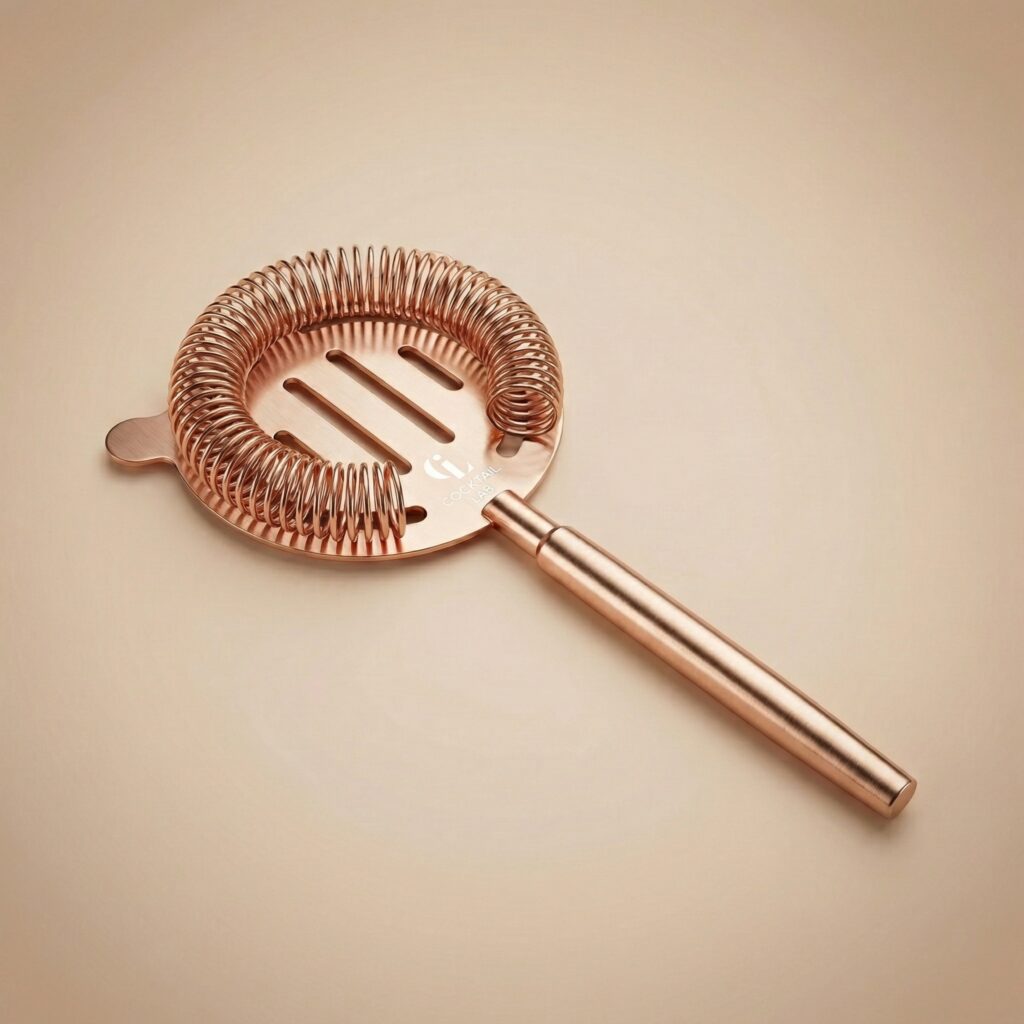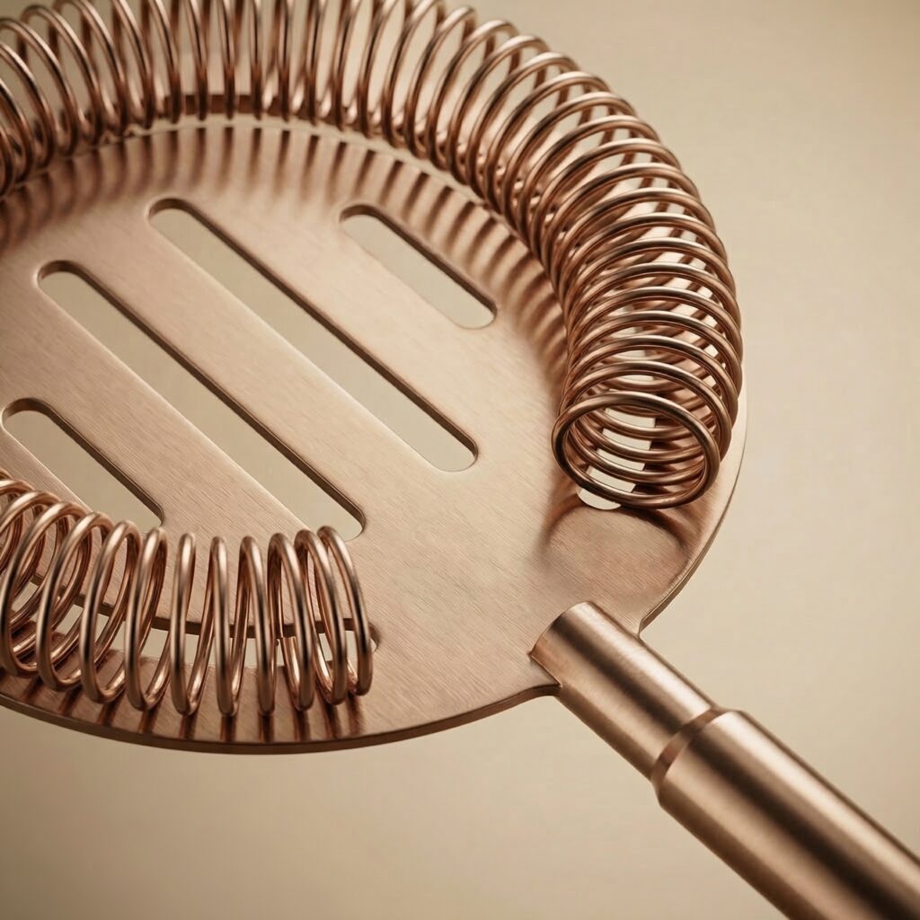 Deze premium cocktail strainer houdt ijs en fruitpulp perfect tegen bij het uitschenken. Gemaakt van zwaar RVS met een matte roségouden afwerking, voor een helder glas en een professionele uitstraling bij elke cocktail.